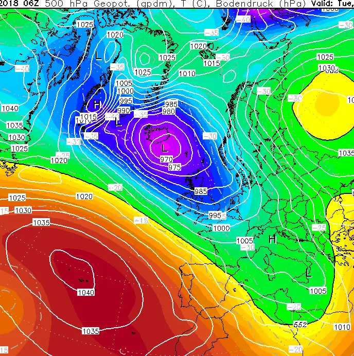 Op de onderstaande schets voor half januari is te zien dat de weersystemen muurvast zitten. De bekende hardnekkige hoge druk der Azoren in combinatie met een ovaalvormige diepe depressie net zuid van IJsland. Tussen die twee systemen in staat op grote hoogte een krachtige ‘jetstream’ die via Zuid-Groenland via Ierland en West-Frankrijk pardoes Spanje aandoet.