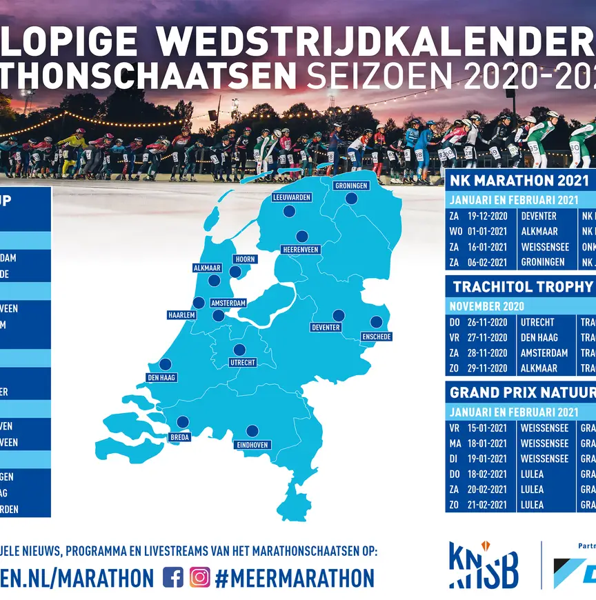 Dan de vertrouwde zaken: het plan is om het peloton gewoon weer van start te laten gaan met de eerste wedstrijd om de Marathon Cup op de pittoreske Jaap Eden IJsbaan in Amsterdam. Die staat wel een weekje later gepland dan gewoonlijk: zaterdag 24 oktober. De slotwedstrijd van het seizoen is weer in de Elfstedenhal te Leeuwarden, op zaterdag 27 februari 2021, zeg maar hetzelfde weekeinde als vorig jaar.