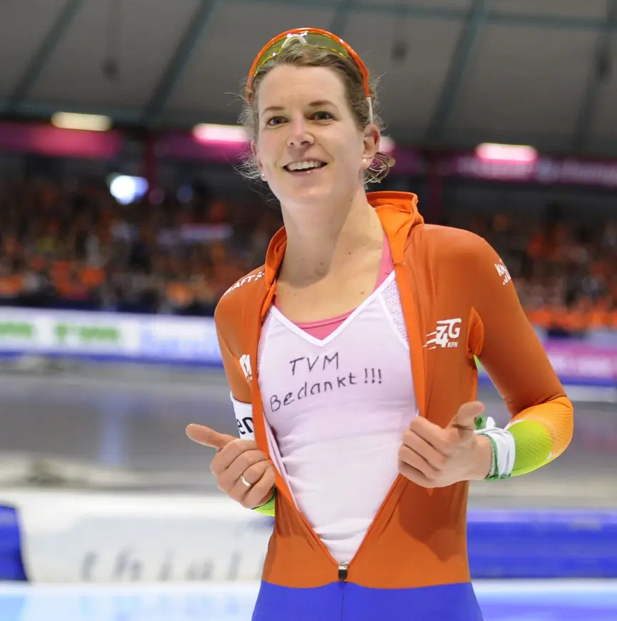 Wüst had op haar ondershirt ook speciaal de boodschap 'TVM bedankt' geschreven, als verrassing voor de sponsor. "Dat heb ik wel netjes gevraagd aan KPN (de hoofdsponsor van de KNSB, red.), ik had het niet gedaan als zij het niet wilden."