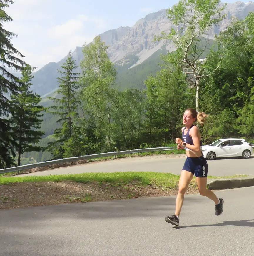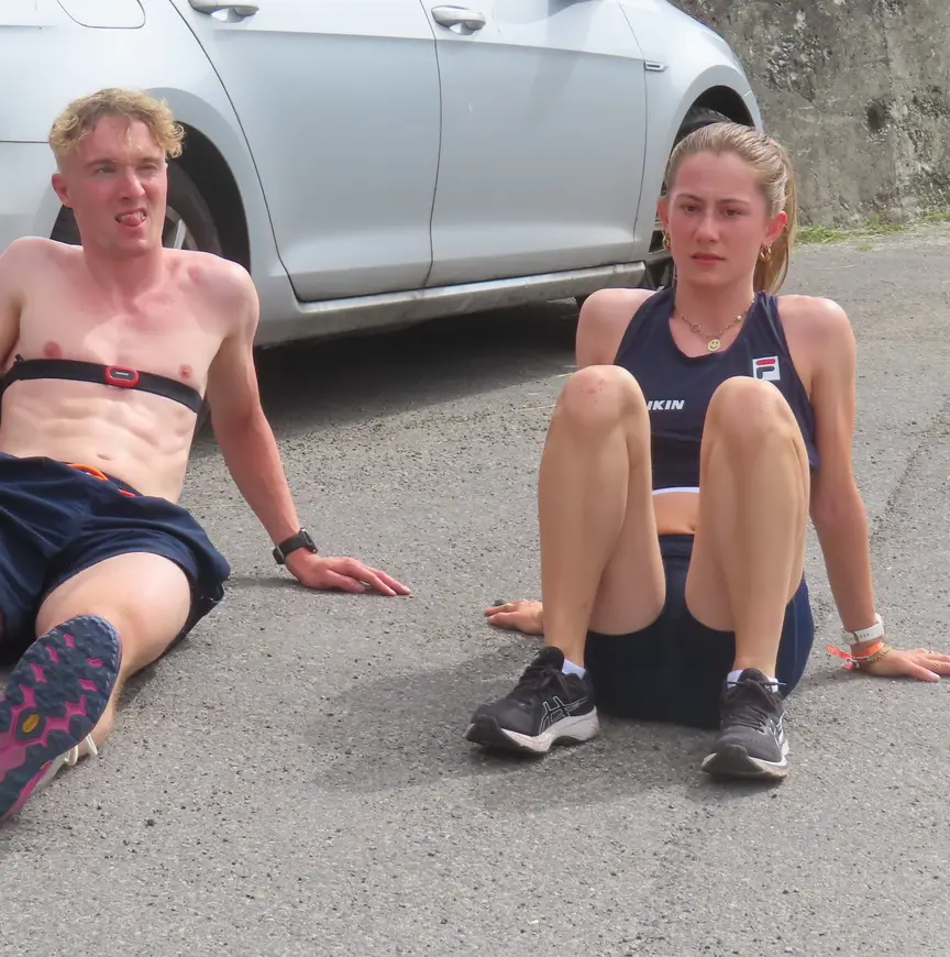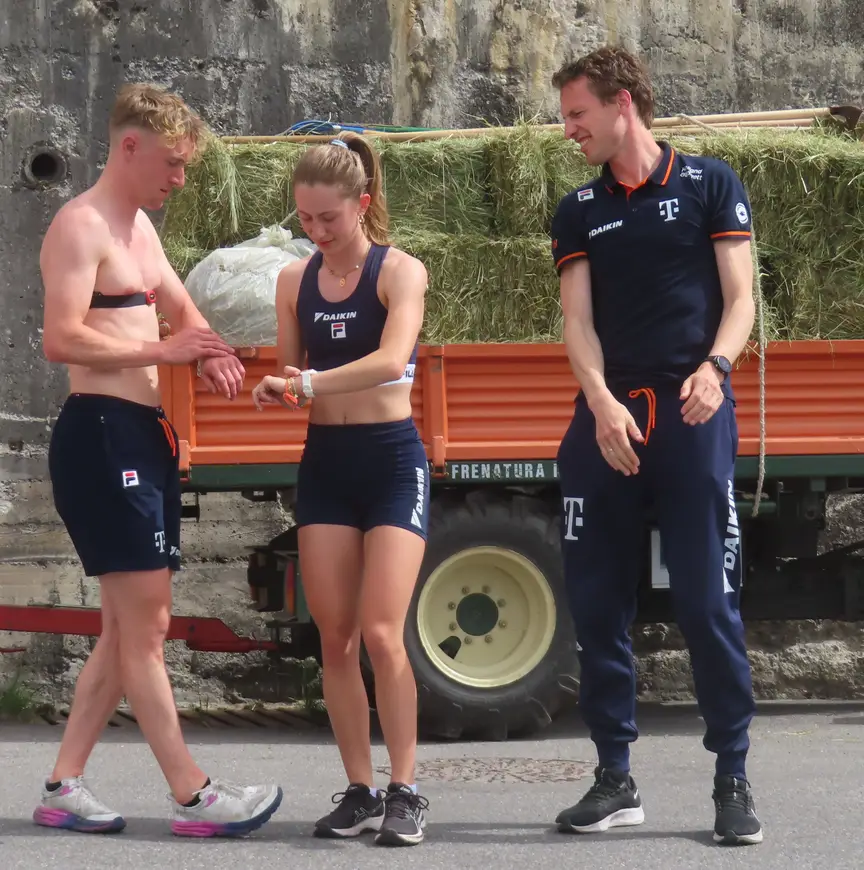 Terwijl mannen als Jens en Melle van ’t Wout, Friso Emons, Bram Steenaart en Itzhak de Laat, en de vrouwen in de persoon van Xandra en Michelle Velzeboer, Yara van Kerkhof, Selma Poutsma en het talent Diede van Oorschot duizelig van de wattages worden, rennen er ook twee sporters op hun gympies naar boven. Sven Roes, lang geblesseerd geweest aan zijn heup en daarom nog niet in staat te lang hoekige (zit)houdingen aan te nemen, zwoegt zich zo vier keer vier minuten in het zweet. Bergop, zal hij naderhand erkennen, is ‘écht niet leuk lopen’. Het lijdt geen twijfel dat zijn vrouwelijke metgezel, debutante in de nationale trainingsselectie, ook leukere dingen kan bedenken op een doordeweekse dag in een sprookjesachtig-mooie omgeving, bij ruim 25 graden.