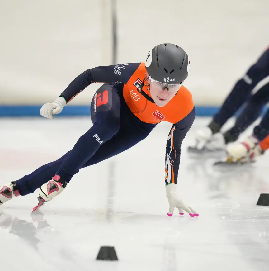 Dat lukte op de ijsbaan, waar ze al als driejarige kleuter steevast in een skipakje in het midden van de ijspiste werd geposteerd door haar mams die moest trainen, trouwens ook niet zo vlug. “Ik ben echter altijd door blijven gaan, omdat ik het zo prachtig vond. Vanaf het eerste moment heb ik gedacht aan grote kampioenschappen, aan Olympische Spelen, want het lijkt me zo gaaf m’n moeder achterna te gaan. Of m’n nicht Avalon Aardoom, zij kon 't ook goed. Ik liet en laat alles vallen voor shorttrack.” Ze knikt slechts na de vraag: ook school?
